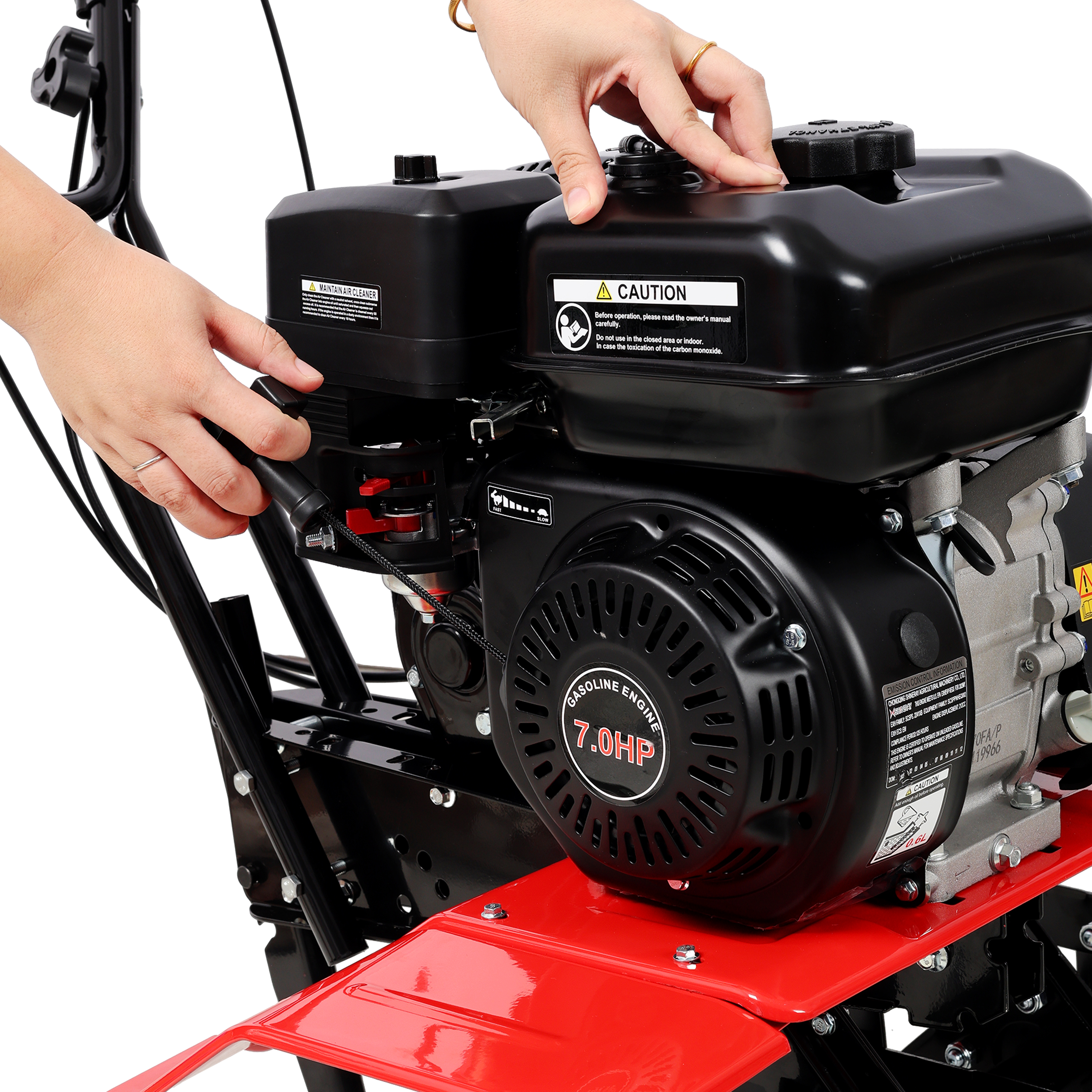 • Powerful 7.0 HP 212cc 4 stroke OHV power tiller cultivator,Easily penetrates into the toughest soil to create a soft soil environment for your next planting project.