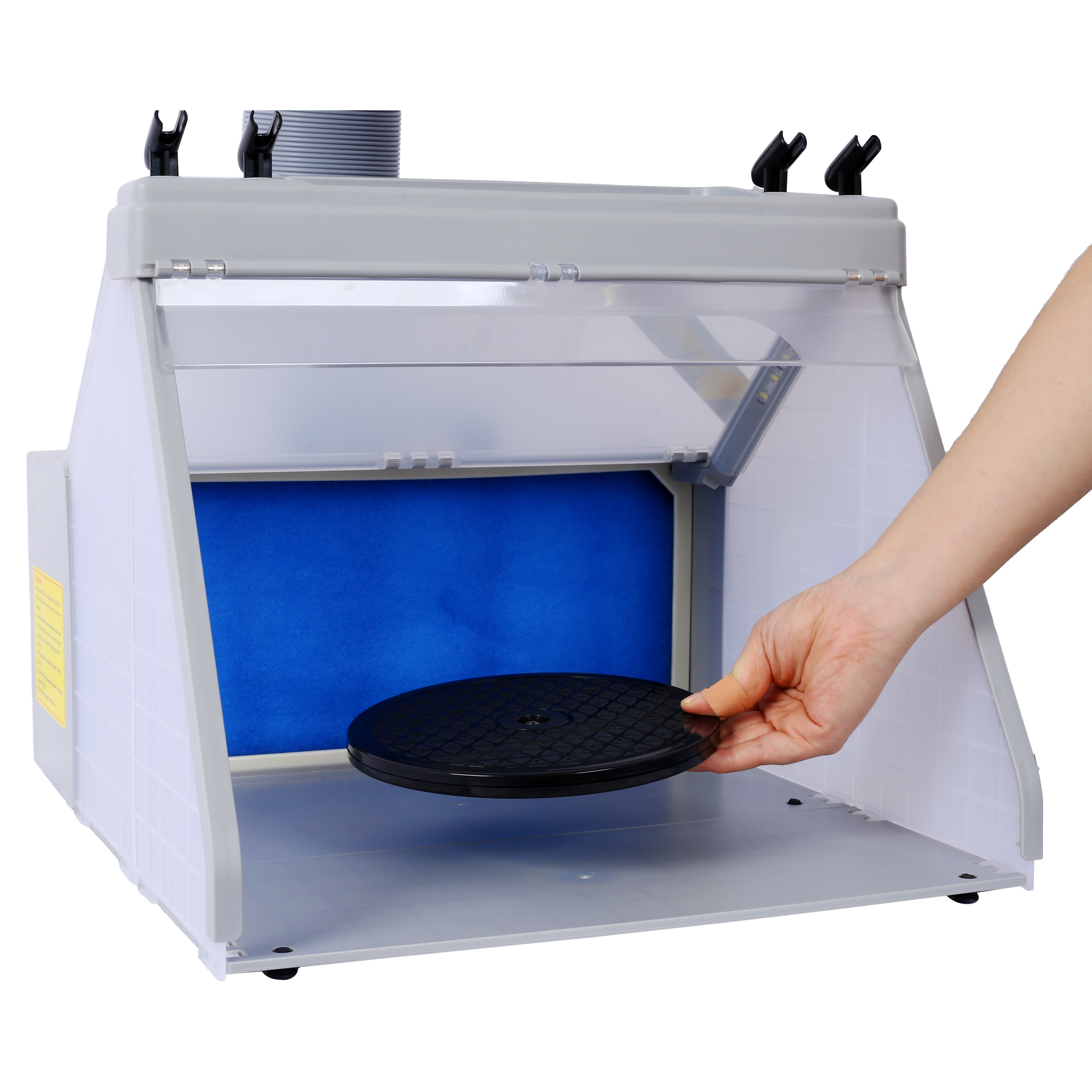 • BRIGHT & CONVENIENT WORKSPACE – Illuminate your projects with three LED lights, while the 360° turntable allows for easy access and detailed inspection of your work. The booth includes one paint holder and four airbrush holders, keeping your tools organized and within reach.